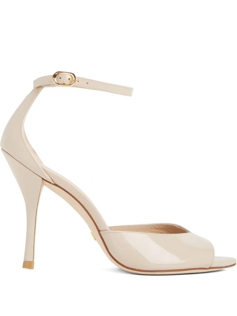 beige patent finish 100mm stiletto heel pointed toe adjustable ankle strap open toe