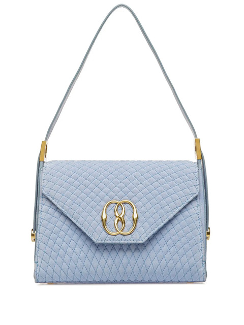 light blue foldover top with magnetic fastening flat top handles internal zip-fastening pocket logo plaque