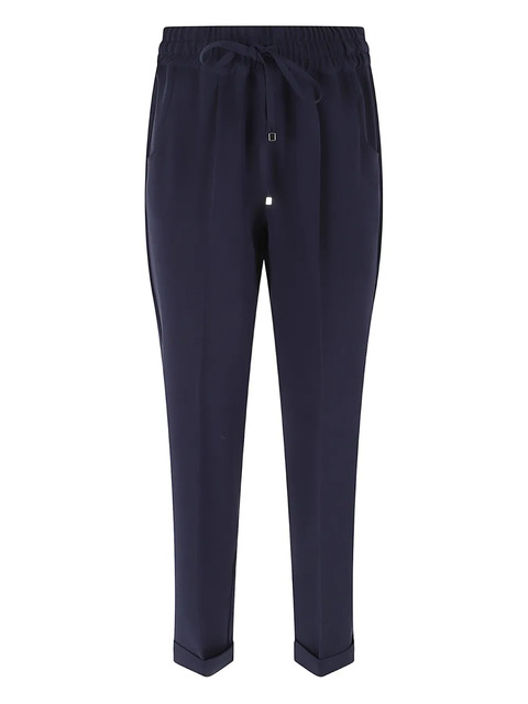 navy blue silk drawstring fastening side seam pockets rear welt pockets cuffed hem