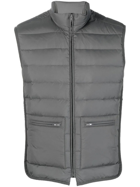 grey down-feather filling signature grosgrain loop tab quilted front zip fastening front zip fastening pockets sleeveless side stripe detailing curved hem