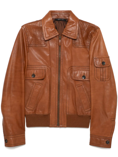 circa 1990-2000s chestnut brown calfskin leather front zip fastening classic collar contrast stitching classic GG canvas long sleeves buttoned cuffs two front button-fastening jetted pockets two side welt pockets ribbed hem Condition: GOOD. This previously owned and used item is in good condition with minimal signs of use. This may include fading of material or plating and scratches.