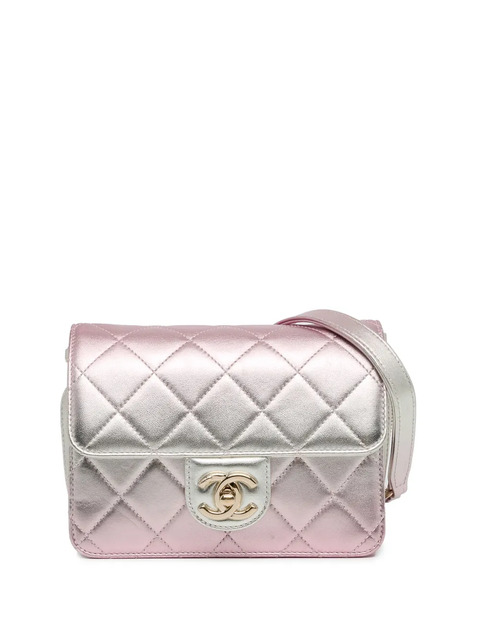 This crossbody bag features metallic quilted lambskin leather body leather woven chain shoulder strap with leather guard flap with a turn lock closure interior open compartment interior zip compartment interior slip pocket. Pink. Serial Number: PHT7XCJC. Condition: GOOD. This previously owned and used item is in good condition with minimal signs of use. This may include fading of material or plating and scratches.