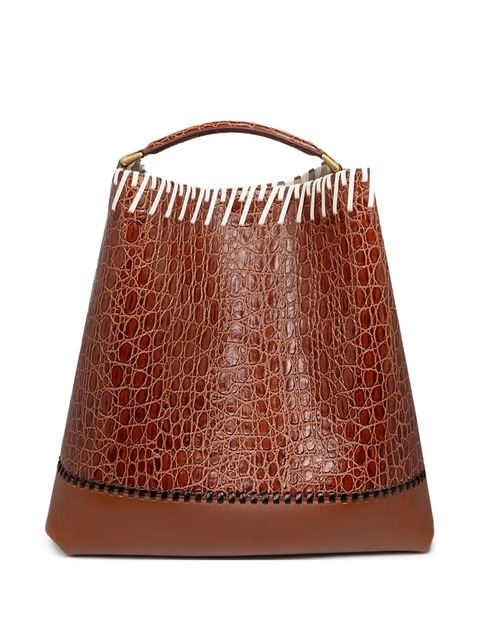 brown embossed leather top handle adjustable shoulder strap contrast stitched trim