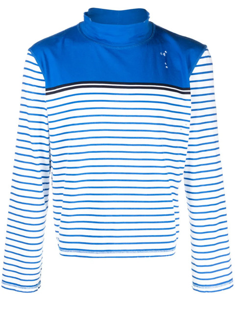 royal blue/white cotton colour-block design distressed effect vertical stripe pattern high neck long sleeves straight hem
