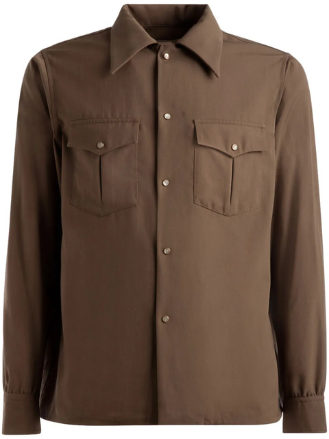 brown pointed flat collar chest flap pockets front press-stud fastening long sleeves press-stud fastening cuffs straight hem