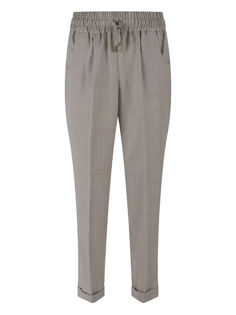 beige check pattern elasticated waistband two rear welt pockets turn-up hem drawstring fastening