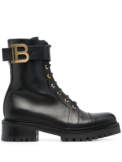 black leather signature B logo plaque round toe front lace-up fastening ankle-length low ridged heel ridged rubber sole