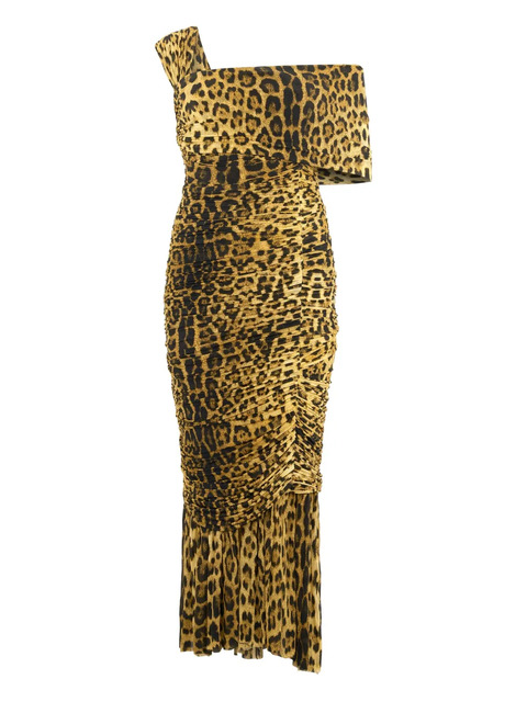 gold leopard print one-shoulder design pleated bodice gathered waist flared hem