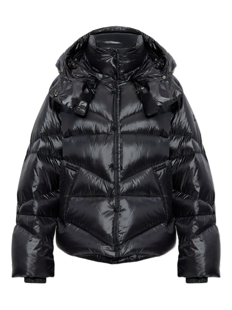 black chevron quilting button fastening hooded logo detail elasticated cuffs