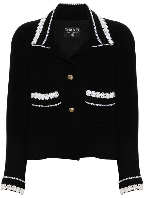 circa 1990s black/white wool crochet trim spread collar front button fastening CC-logo embossed gold-tone buttons two front patch pockets long sleeves straight hem