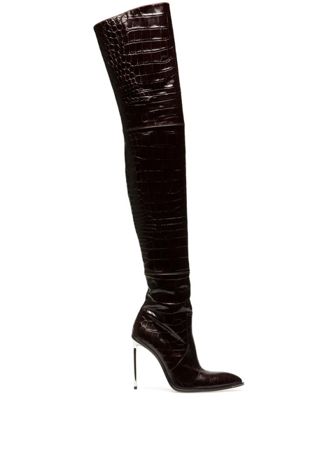 coffee brown calf leather embossed crocodile effect above-knee length side zip fastening pointed toe high stiletto heel leather sole