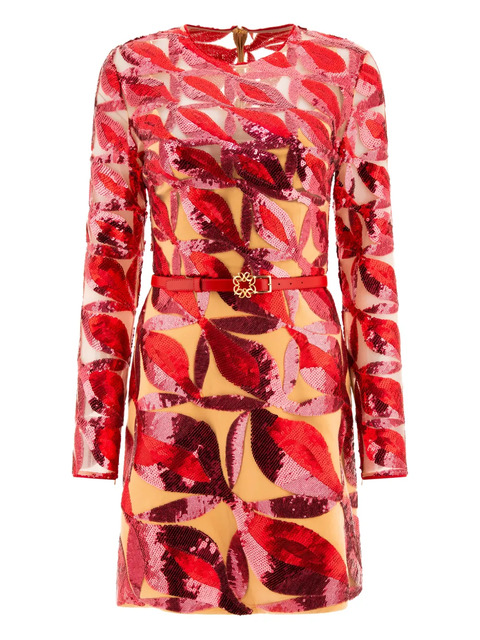 red sequin embellishment leaf pattern long sleeves belted waist concealed zip fastening