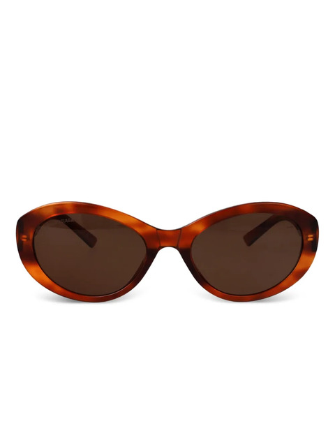 brown oval frame logo lettering tinted lenses These glasses come with a protective case.