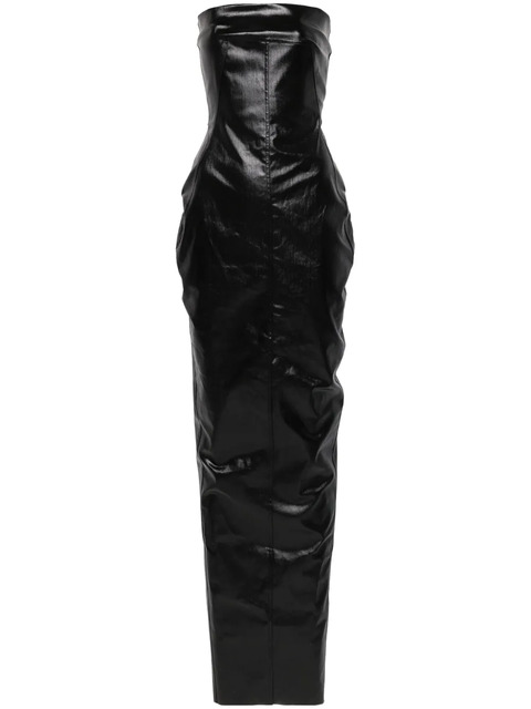 black cotton blend coated finish seam detailing square neck rear zip fastening strapless pencil silhouette rear slit