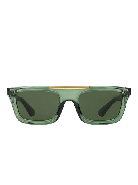 dark green gold-tone accents wide rectangle shape bold brow bar subtle logo detailing tinted lenses These glasses come with a protective case.