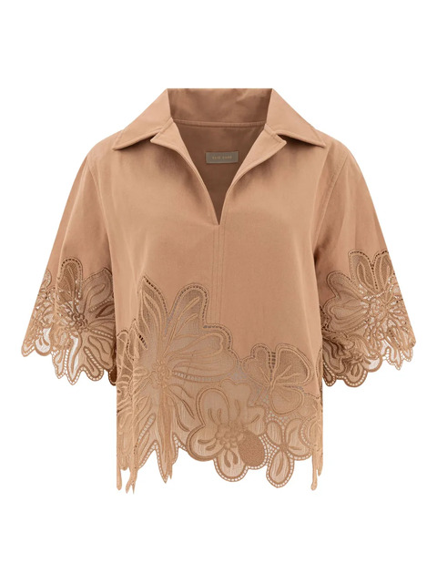 brown embroidered floral lace short sleeves straight hem