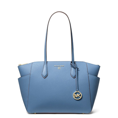 Michael Kors Ladies Tote. SKU: 30S2G6AT2L-457. Color: Blue. Size: W:15 x H:10 x D:4.75. Michael Kors Marilyn Medium Leather Tote Bag. This tote bag features two side slip pockets on the exterior, with interior details including a back zip pocket and two front slip pockets, a polyester lining, and a zip fastening. 100% Leather, 100% Polyester.