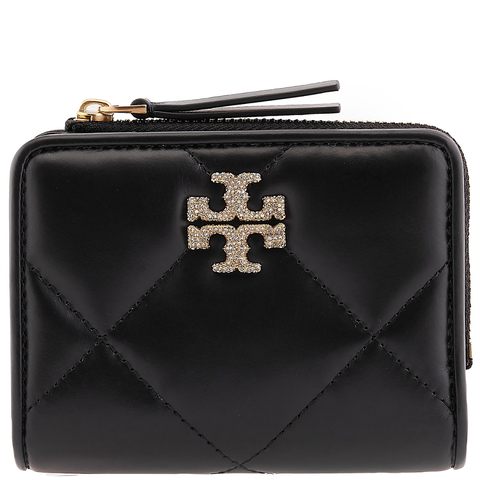 Tory Burch Ladies Wallets. SKU: 161341-001. Color: Black. Size: Height: 3.5 (8.8cm) x length: 4.7 (12cm). Tory Burch Ladies Black Kira Diamond Quilt Pave Logo Bi-Fold Wallet. Crafted from nappa leather, this wallet features a pin snap closure, a quilted design, and beveled Double T hardware embellished with pave crystals. It includes one zipper coin pocket, one bill pocket, two slit pockets, and six card pockets.