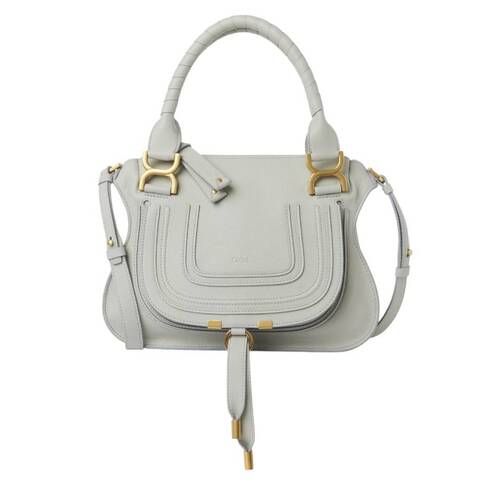 Chloe Ladies Top Handle Bag. SKU: CHC22AS628I3140W. Color: Blue Mist. Size: W: 11.8 x H: 9.1 x D: 3.5. Chloe Grained Leather Small Marcie Bag. Crafted from grained calfskin, this small Marcie purse features a softly structured silhouette with feminine curves and signature saddle stitching. Gold-tone buckles, hand-wrapped double handles, and the line's signature dangling leather tassels add refined detail to the flap closure. Designed for versatile wear, it can be carried by hand, worn over the shoulder, or styled cross-body using the removable leather strap secured with hooks. The interior offers a roomy compartment with a zippered pocket, while a front slip pocket is discreetly hidden beneath the flap for added functionality. Material: Calfskin. Made in Italy.