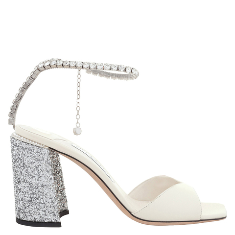 Jimmy Choo Ladies Sandals. SKU: J000168277. Color: Latte/Silver. Jimmy Choo Saeda 85 Sandals In Beige Leather. Elegant and eye-catching, these Italian-made sandals feature a square open toe, ankle strap with crystal embellishment, and subtle glitter details. Crystal and glitter accents. Ankle strap. Leather sole. Heel height: 3.5 (90 mm). Made in Italy. <br/><br/><b>Please visit the brand website for sizing information.</b>