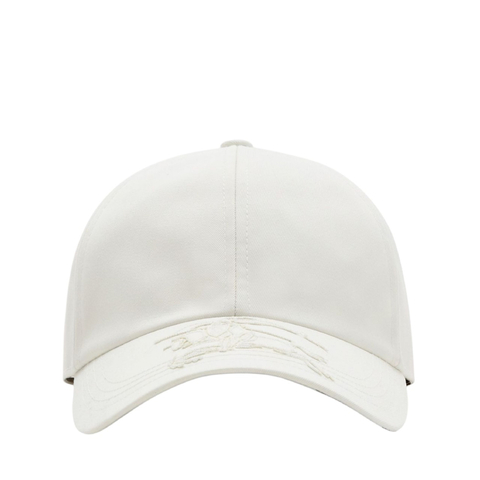 Burberry Unisex Hats. Fashion category: Hats. SKU: 8085731. Color: Salt. Burberry Ekd-Embroidered Cotton Blend Baseball Cap. This cap features a curved peak, eyelet detailing, tonal stitching, and the signature Equestrian Knight motif, with a curved narrow brim and an adjustable strap at the rear. Lining: Cotton 100%, Outer: Polyester 66%, Cotton 34%. Made in Italy.