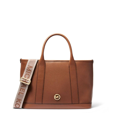 Michael Kors Ladies Tote. SKU: 30R4G99S2L-230. Color: Luggage. Size: W:14.5 x H:9.25 x D:5.5. Michael Kors Luisa Medium Leather Tote Bag. This tote bag is made of calfskin with a grainy texture and features a logo brooch, an open back pocket, an open top design with a magnetic closure, two top handles, and an adjustable, detachable shoulder strap with a brand logo jacquard. It also has a logo jacquard lining, a brand logo inner seal, and an interior zippered pocket. 100% Calf Leather.