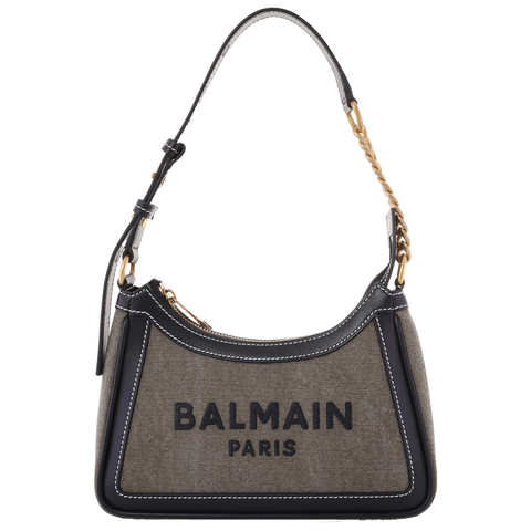 Balmain Ladies Shoulder Bag. SKU: DN1BT743TCLB-KAKI/NOIR. Barcode: 3615884790076. Color: Kaki/Noir. Size: 19 x 12 x 7.5 cm. Balmain B-Army Canvas Bag With Leather Inserts. Crafted from a blend of canvas and calfskin, this bag features a two-material chain and a top zip fastening with a gold finish. It includes a spacious main compartment, a zip top closure, and is adorned with the Balmain logo print on the front for a signature touch.