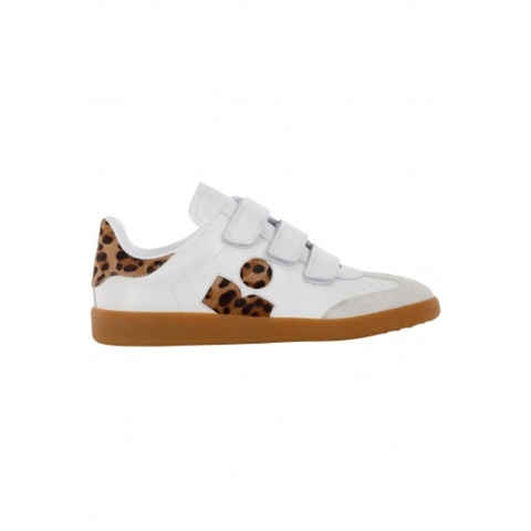 Isabel Marant Ladies Sneakers. SKU: 24ABK0013FA-B3E02S-LEOPARD. Color: Leopard. Isabel Marant Ladies Leopard Beth Printed Low-Top Leather Sneakers. This pair of leather sneakers is crafted from calfskin leather with Pony style details featuring a leopard print. They have round toes in suede calfskin leather, a padded tongue, and Velcro straps. The side yoke is adorned with a contrasting IM logo, while the back yoke features the Isabel Marant logo. Soft leather insoles and lining provide comfort, and the sneakers are set on rubber outsoles. <br/><br/><b>Please visit the brand website for sizing information.</b>