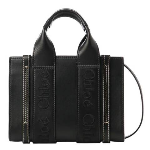 Chloe Ladies Tote. Woody series. SKU: CHC23SP237I60001. Color: Black. Size: W: 7.9 x H: 5.5 x D: 1.6. Chloe Mini Woody Leather Tote Bag. This tote bag is made from luxurious smooth calfskin, accented with shiny calfskin strips and a linen lining. Its sleek, modern design is enhanced by vertical leather strips and the brand's signature logo ribbon. The bag features a main compartment that fits a mobile phone and offers versatile carrying options: by hand, on the shoulder, or cross-body. 100% Calfskin.