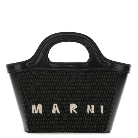 Marni Ladies Tote. SKU: BMMP0067Q0P386000N99. Color: Black. Marni Tropicalia Micro Bag. The Tropicalia Micro Bag blends leather and raffia-effect fabric in a compact, structured silhouette. Designed for versatility, it can be carried by hand or worn crossbody with the removable strap. Features include a leather flap closure, embroidered logo on the front, and gold-tone metal hardware. Finished with a sturdy leather base and cotton lining for added durability. Embroidered front logo. Top handles and removable crossbody strap. Leather flap closure. Leather base and cotton lining. Gold-tone metal hardware. Messurements: H: 7.09 x L: 8.66 x W: 3.94. Handle Drop: 1.57; Shoulder Strap Length: 53.15. Materials: Body: 52% Cotton, 48% Polyamide. Contrast: 100% Calf Leather. Lining: 100% Cotton. Metal: Brass, Zinc, Aluminum, Copper. Made in Italy.