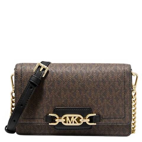 Michael Kors Ladies Crossbody. SKU: 32F2G7HC1B-292. Color: Brown/Blk. Size: 7W X 4.25H X 2.25D. Michael Kors Extra-Small Heather Logo Crossbody Bag. This crossbody bag is crafted from logo-print canvas and faux leather, accented with gold-tone hardware for a polished touch. It features a convenient back snap pocket on the exterior, while the interior offers impressive organization with four back slip pockets, three front zip and slip pockets, and eleven card slots. The bag is finished with a secure snap fastening, making it both stylish and functional. 89.4% coated canvas, 9.6% polyester, 1% polyurethane.