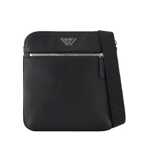 Emporio Armani Mens Shoulder Bag. SKU: Y4M185Y138E81072. Color: Black. Size: L 9.25 x H 9.25' x W 1.57. Emporio Armani Eagle Plate Saffiano Leather Shoulder Bag. This shoulder bag is crafted from regenerated Saffiano leather made using certified recycled materialsan eco-conscious alternative that mirrors the look and feel of real leather while minimizing environmental impact. The leather is created through a sustainable process that re-purposes leftover materials without adhesives and with careful water conservation. Designed for the modern Emporio Armani man seeking both style and functionality, the bag features a clean, structured silhouette accented by a perforated metal eagle logo plate. It is equipped with a secure zip closure, a zipped outer pocket for easy access, and an adjustable logo webbing strap for versatile wear. Fabric: 53% polyamide, 47% polyester; outside coating: 100% polyurethane; material: 100% bonded leather; lining: 100% polyester.