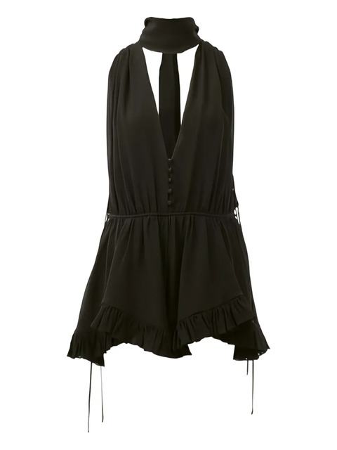 black v-neck button fastening ruffle trim tie detail sleeveless
