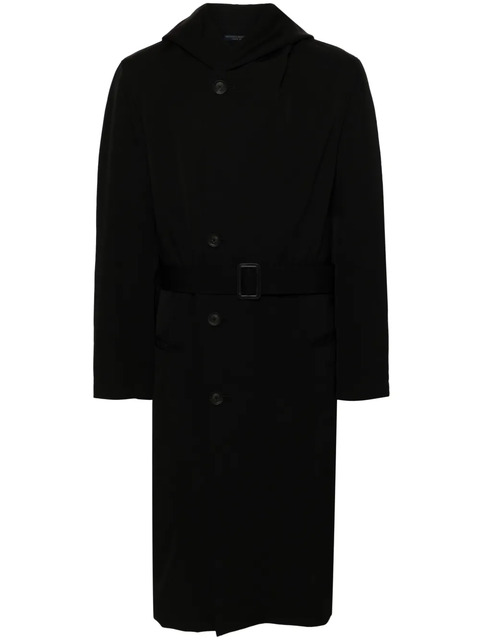 black wool textured finish classic hood long sleeves belted waist two side jetted pockets central rear vent full lining long length straight hem front button fastening