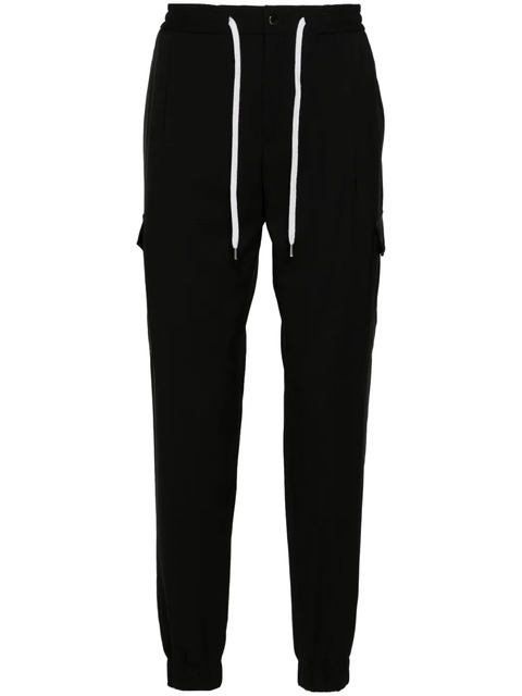 black virgin wool pleat detailing tapered leg mid-rise elasticated drawstring waistband concealed fly and button fastening two diagonal pockets to the sides two side flap pockets two rear button-fastening jetted pockets elasticated ankles