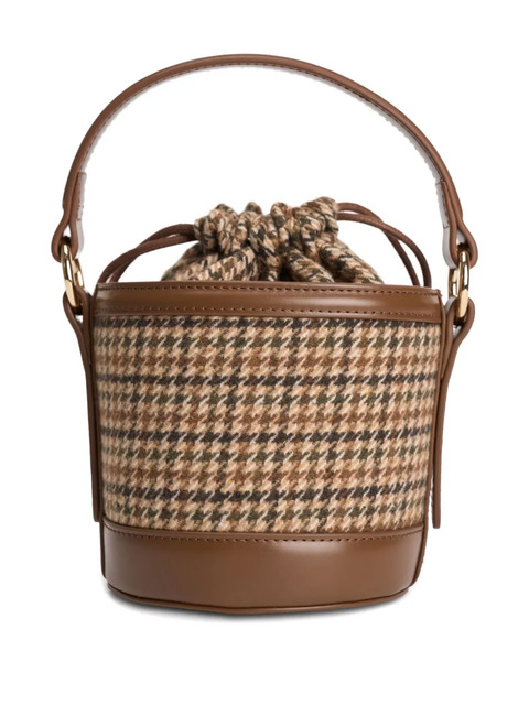brown houndstooth pattern top handle detachable shoulder strap drawstring fastening logo lettering
