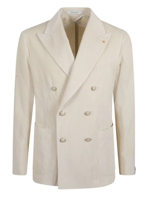 cream corduroy texture double-breasted peak lapels button fastening chest welt pocket front flap pockets