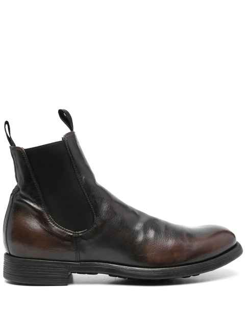 dark brown calf leather smooth grain distressed effect pull-on style low stacked heel ankle-length double pull-tab at the opening elasticated side panels round toe branded leather insole rubber sole