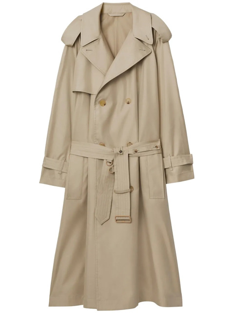 beige silk gabardine weave notched collar epaulettes storm flap double-breasted button fastening detachable waist belt two side inset pockets long sleeves belted cuffs central rear vent straight hem mid-length