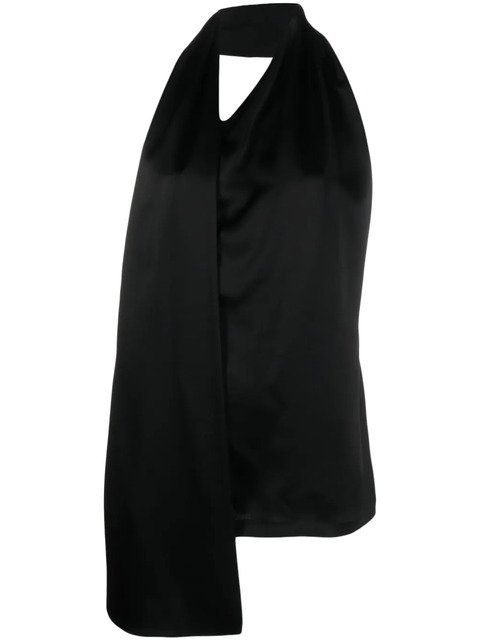 black satin finish wraparound style halterneck sleeveless open back straight hem