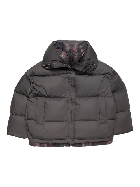 grey plaid detail zip fastening button fastening high neck quilted