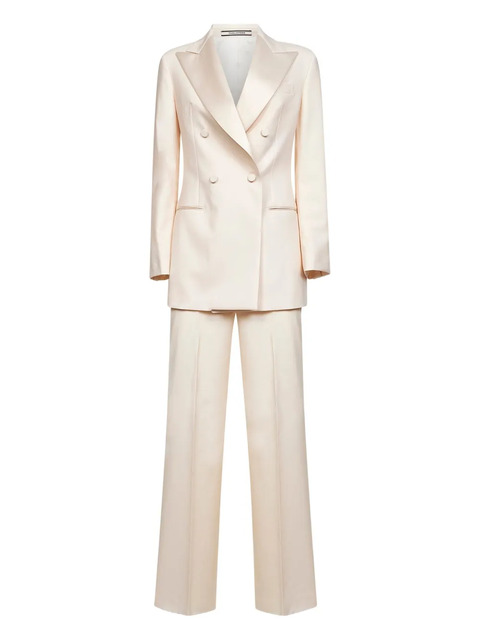 ivory satin peak lapel four-button placket welt pockets pressed leg creases central slit