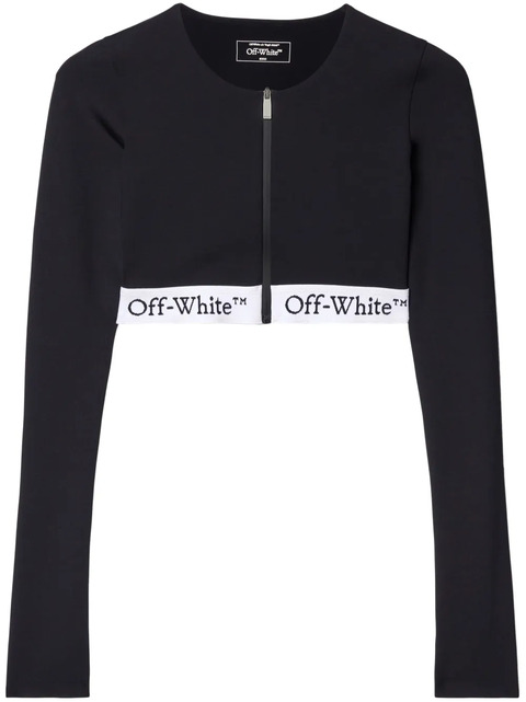 black/white soft scuba jersey logo underband round neck front zip fastening long sleeves cropped straight hem