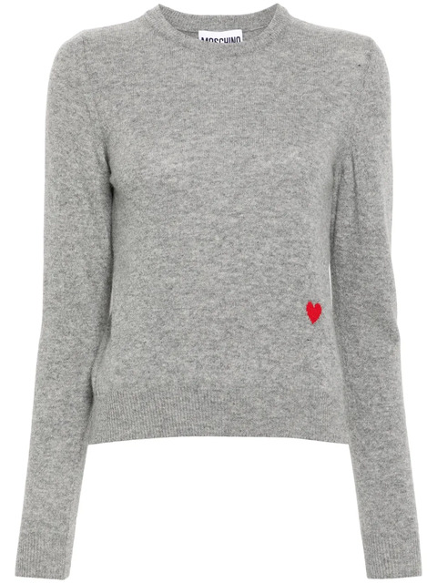 grey virgin wool-cashmere blend knitted construction crew neck long sleeves ribbed cuffs and hem embroidered heart to the front straight hem