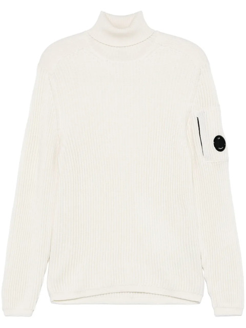 ivory white virgin wool blend ribbed knit signature Lens detail roll neck long sleeves sleeve zip pocket straight hem C.P. Company suggests removing any detachable accessories before washing.