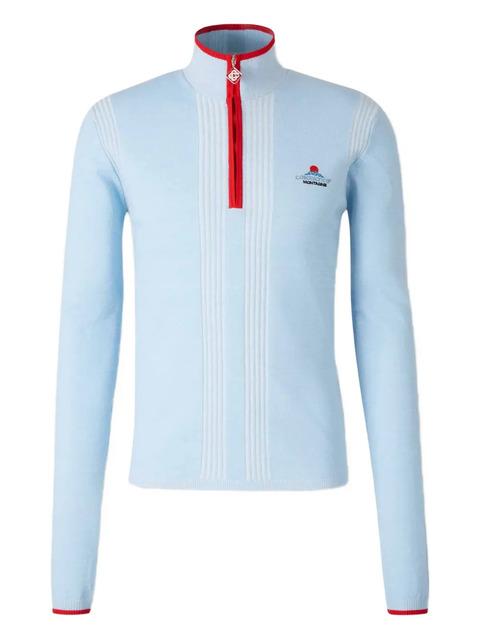 blue ribbed trims embroidered logo front zip closure high collar vertical ribbed knit