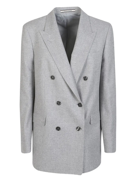 pearl grey double-breasted button fastening peak lapels flap pockets long sleeves