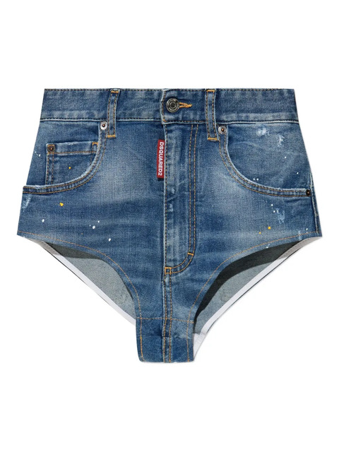 blue denim pockets button fastening contrast panels paint splatter detail