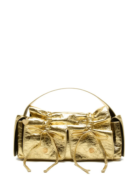 gold leather material top handle drawstring fastening heart charm embossed logo detail