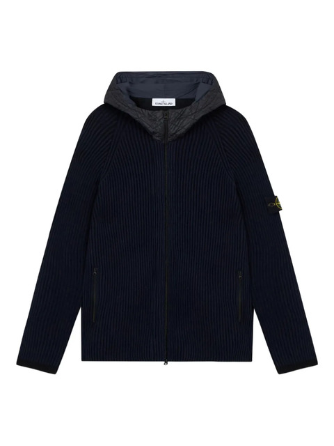 blue ribbed knit zip fastening quilted hood logo patch long sleeves